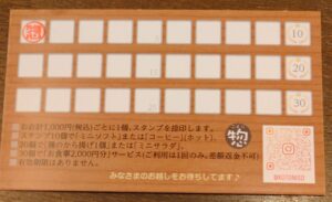 ポイントカードサービス始めました!!1000円で1スタンプ。10ポイント、20ポイントでそれぞれミニプレゼント!30ポイント貯めると2000円割引いたします!!ランチ・ディナーどちらでもお使いいただけます。なお、他の割引と併用はできません。あしからずご了承くださいませ。皆様のお越しを心からお待ちしております!!